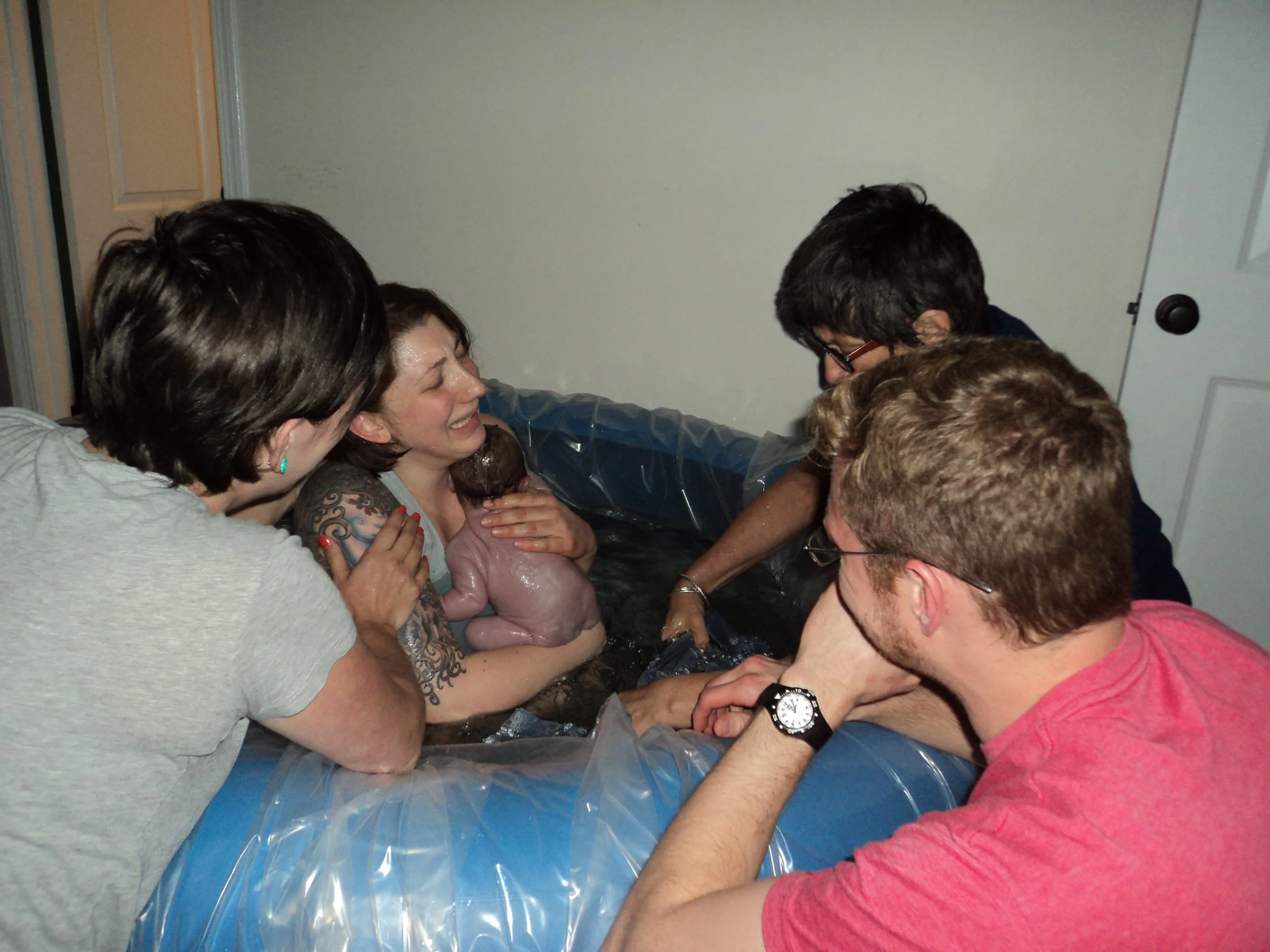 I didn’t even push. My baby was shooting out of my body like a freight train. “Her head is out!” I screamed. Everyone cheered. At that exact moment my midwife came dancing down the hall crying, singing, “Thankya JESUS!” over and over. She plunged her hand into the pool and scooped my baby up out of the water.